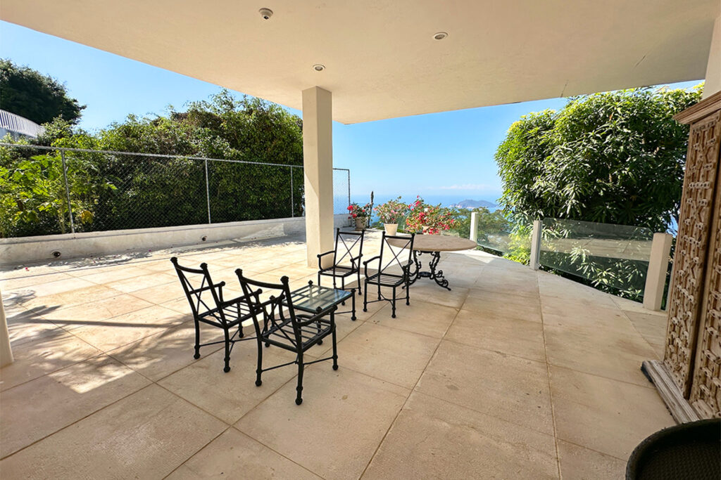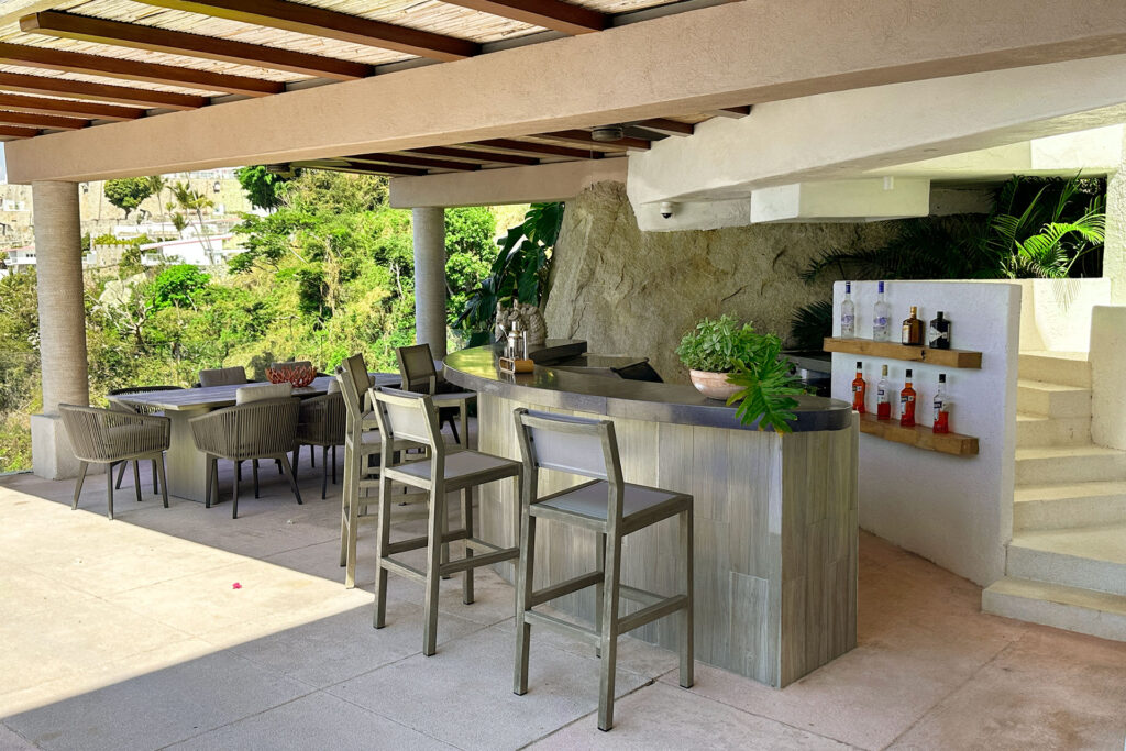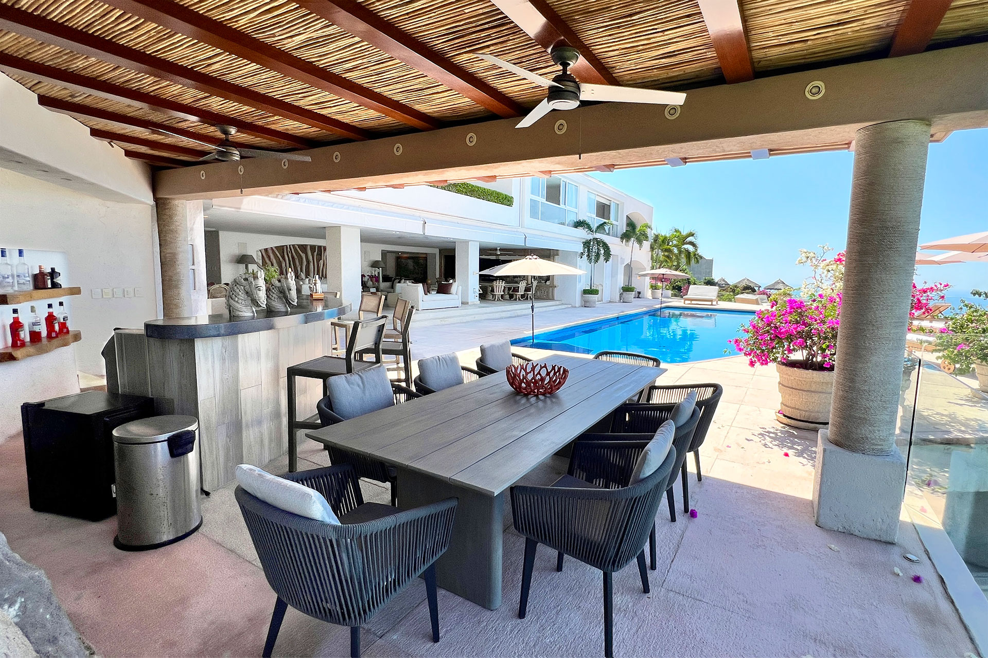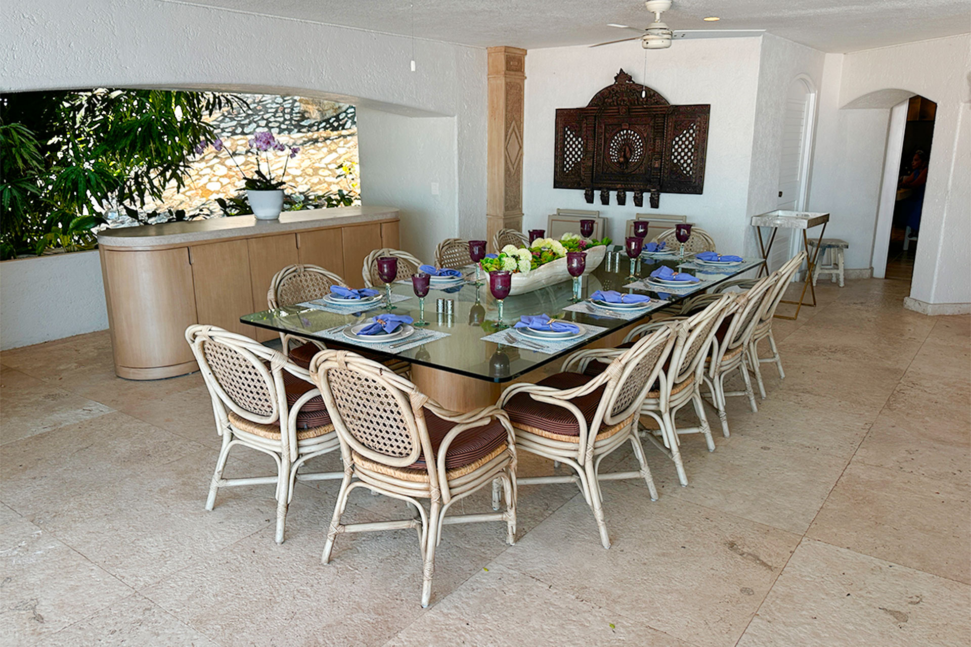 • Segundo comedor para 8 personas en el exterior, techado junto a la alberca y vista a la bahía.