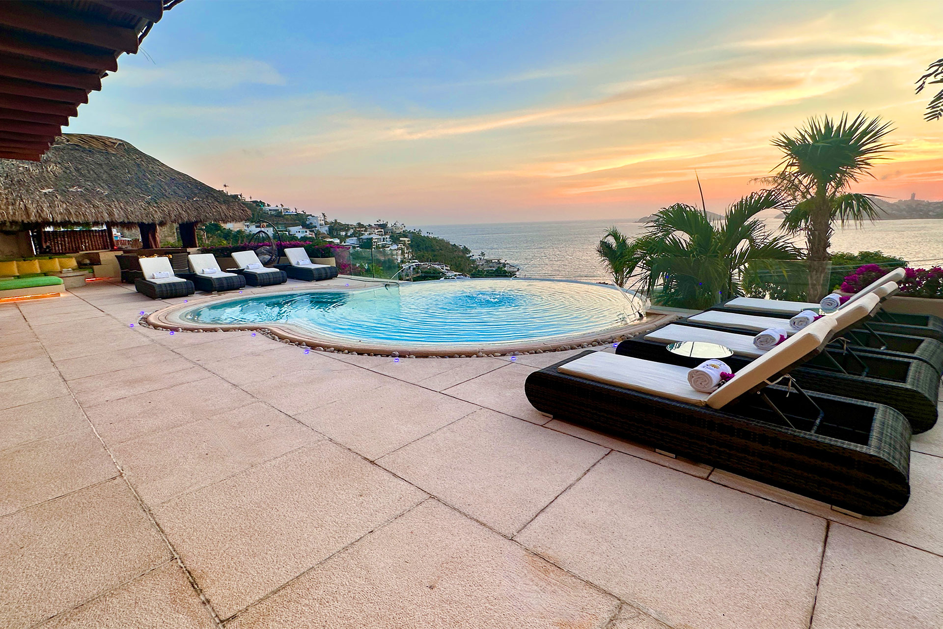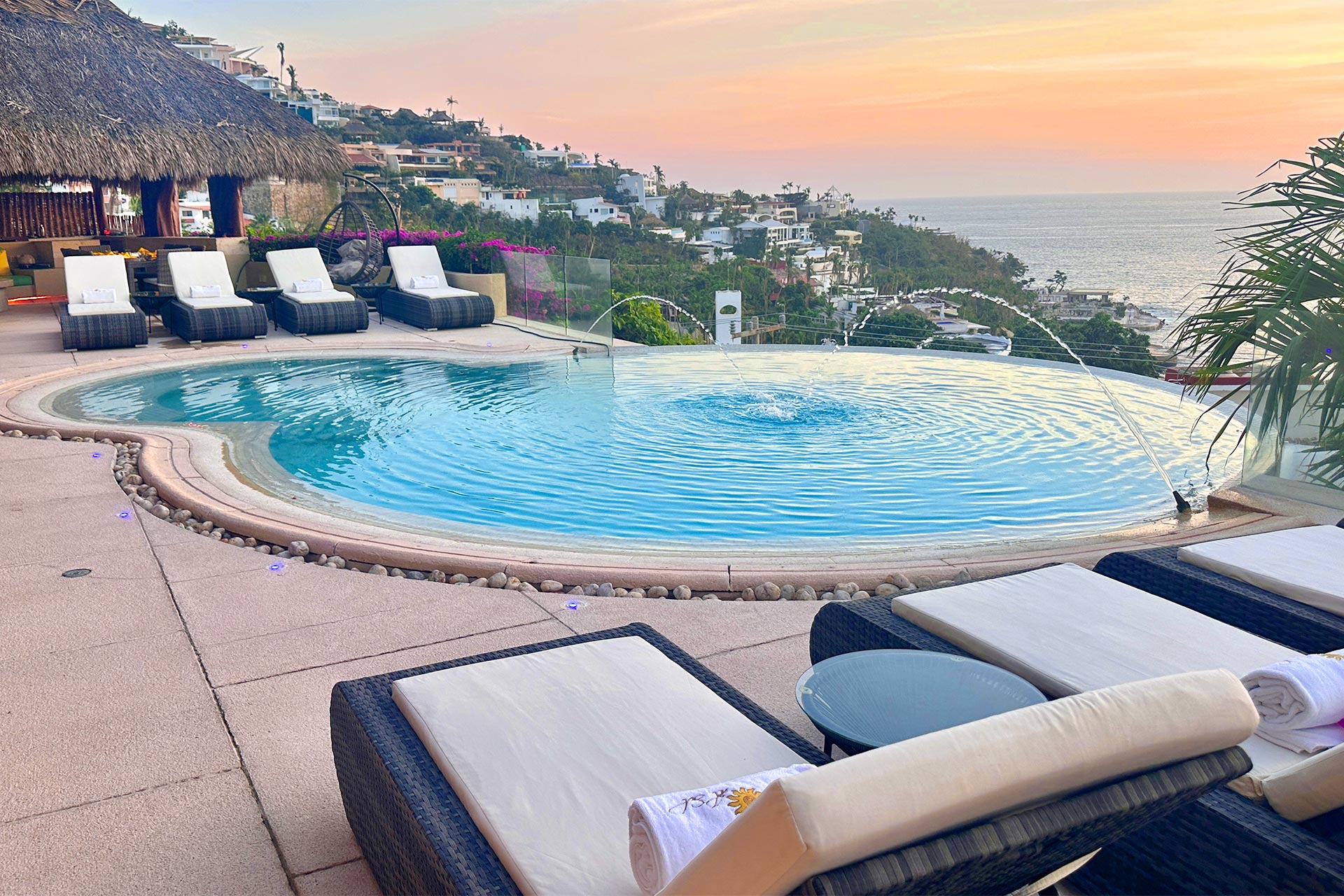 • Una Gran alberca tipo infinity con una fuente de remolino, camastros para disfrutar del sol y una cama lounge.