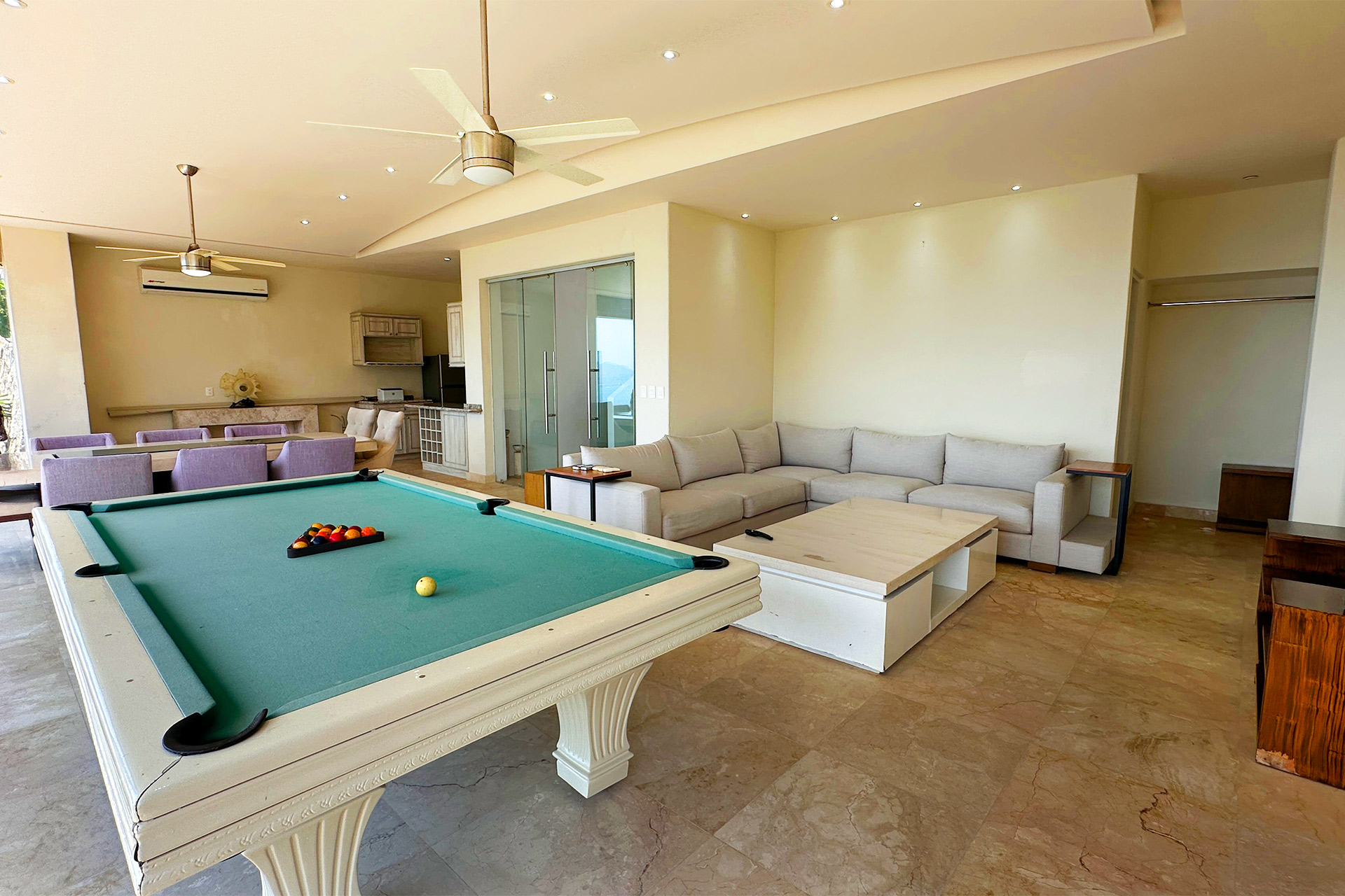 • En planta baja se encuentra la sala de juegos, cerrada con A/C, con sala, comedor mesa de billar, Smart Tv con Sky y bar.